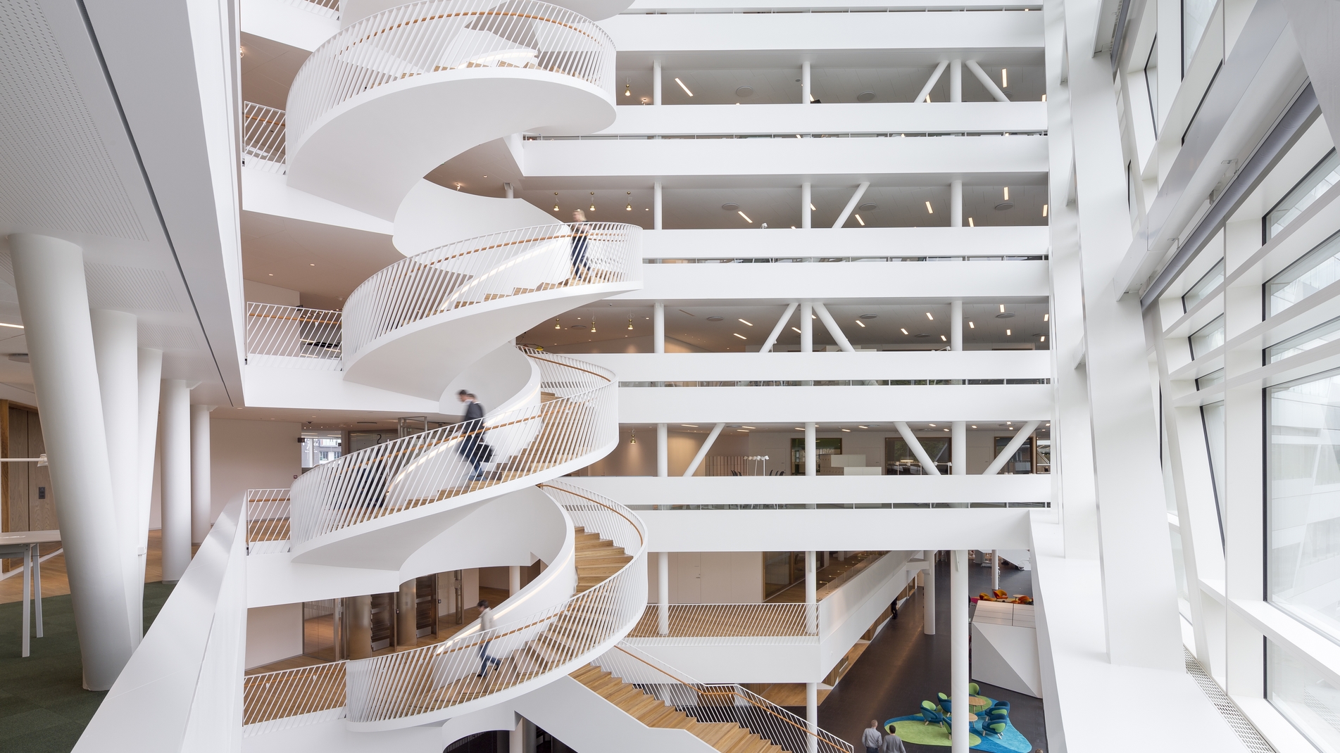 Bygningens to store hovedtrapper – de forskudte vindeltrapper – er både store og kraftige og strækker sig over henholdsvis seks og syv etager. Det specielle ved disse vindeltrapper er, at niveauerne hænger lidt forskudt i stedet for lige under hinanden.