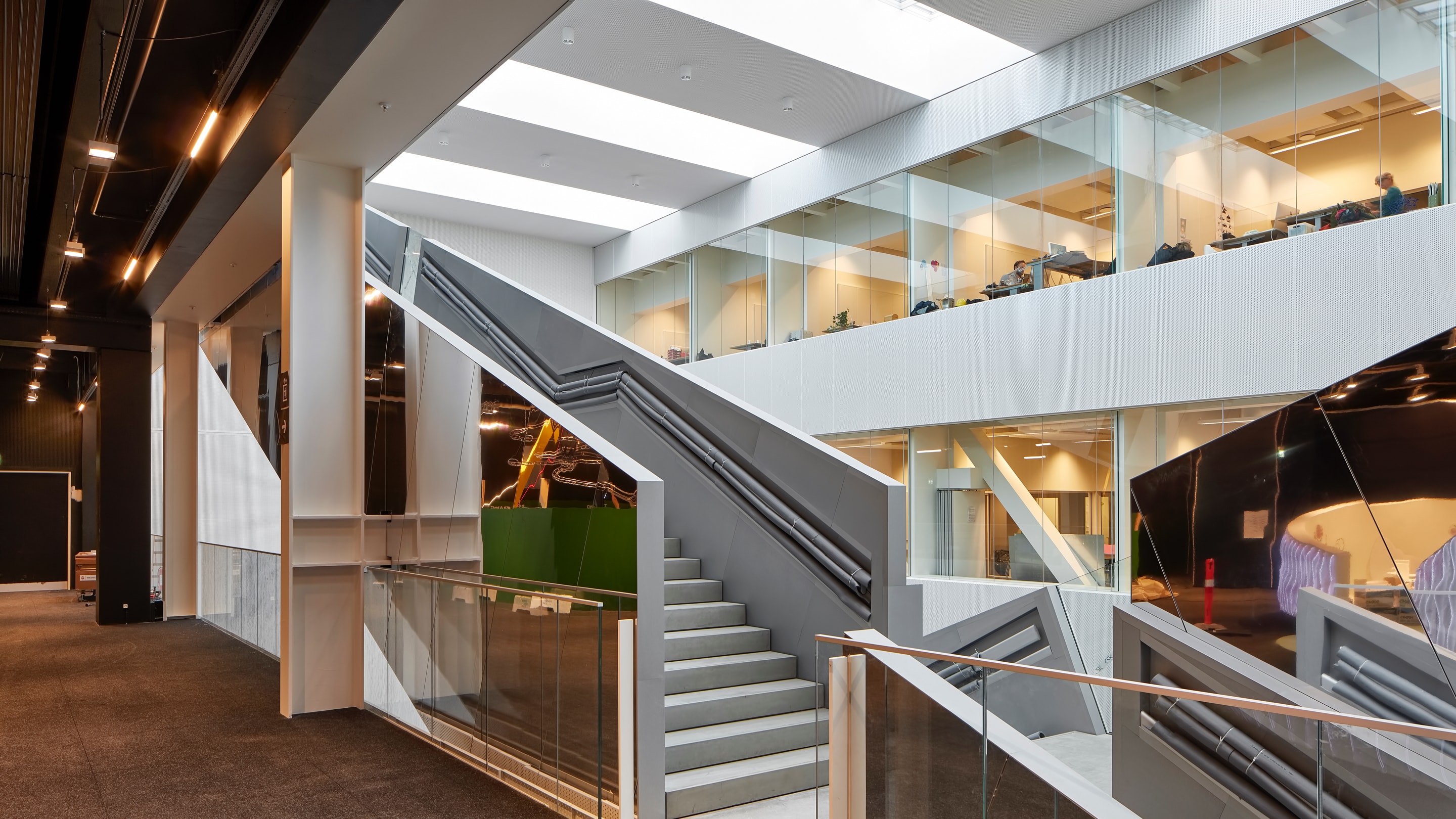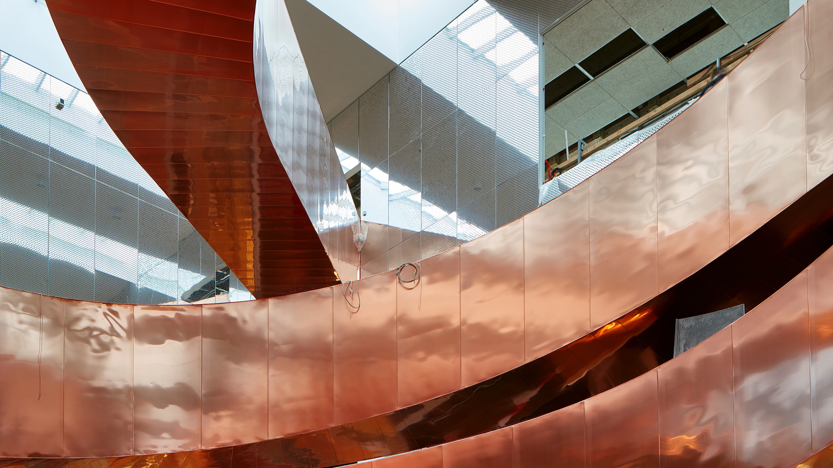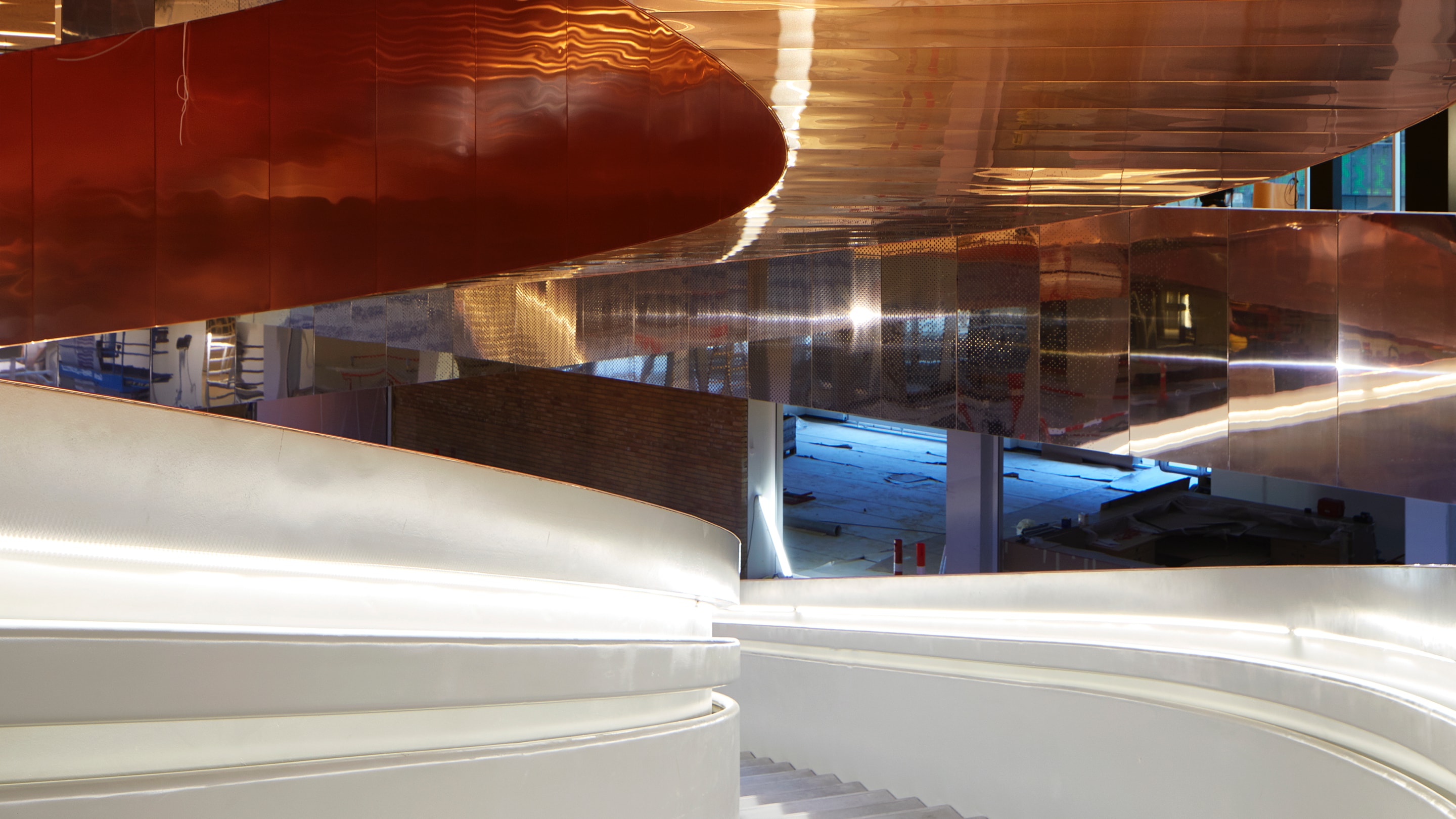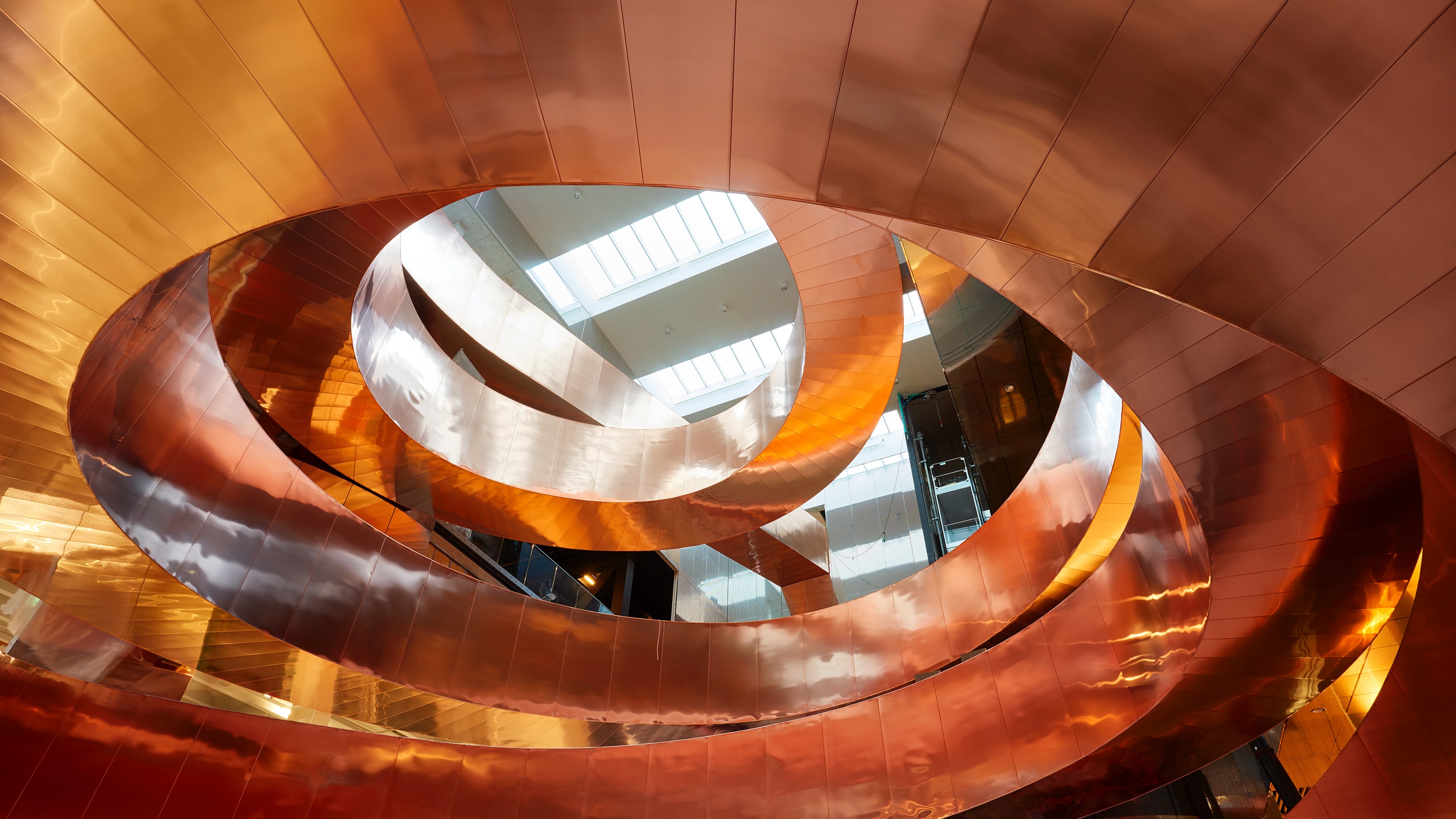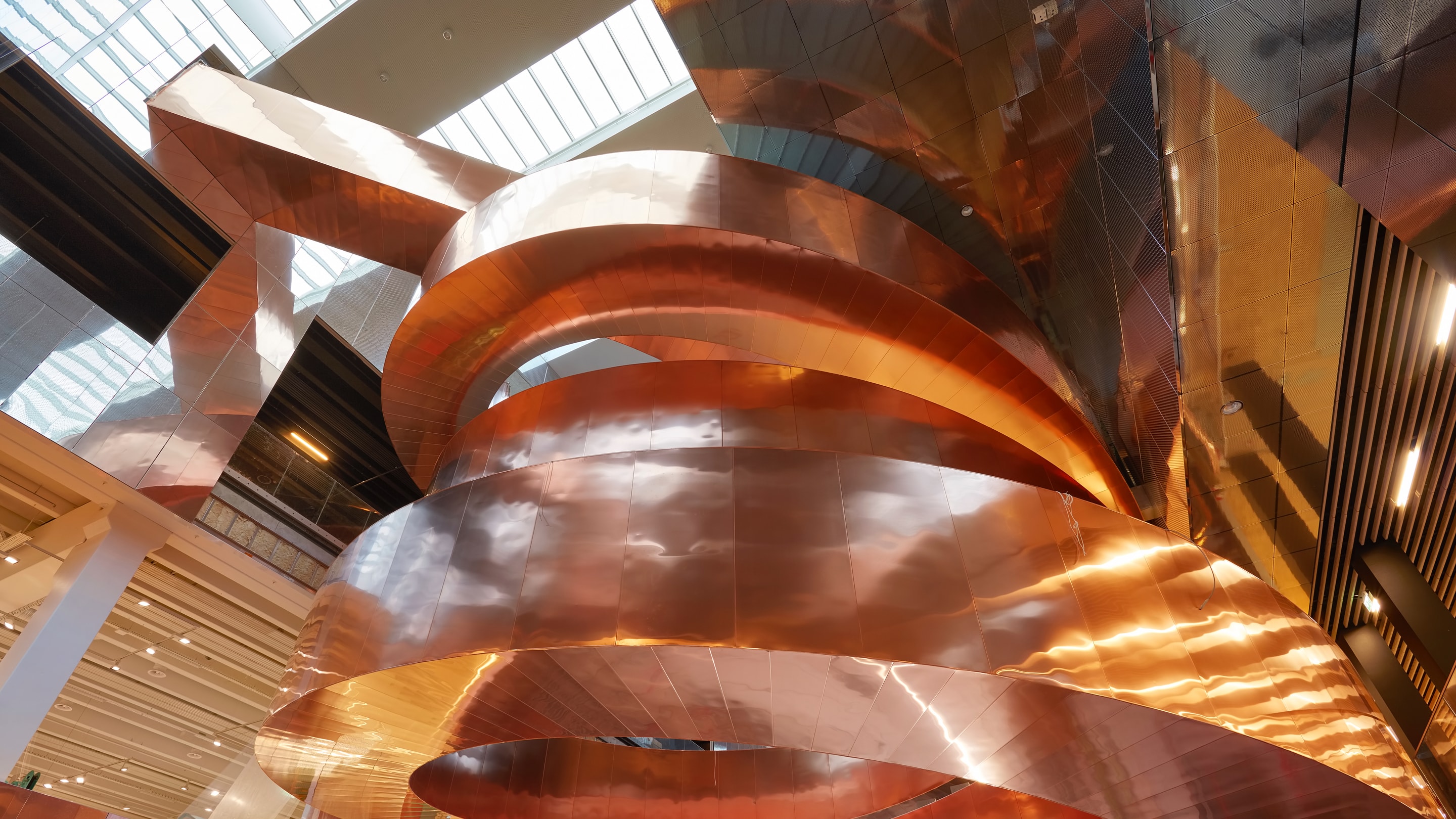The total staircase weighs 280 tonnes, and was produced, delivered and installed by CSK. The 10 tonnes of copper were subsequently installed by AE Stålmontage.