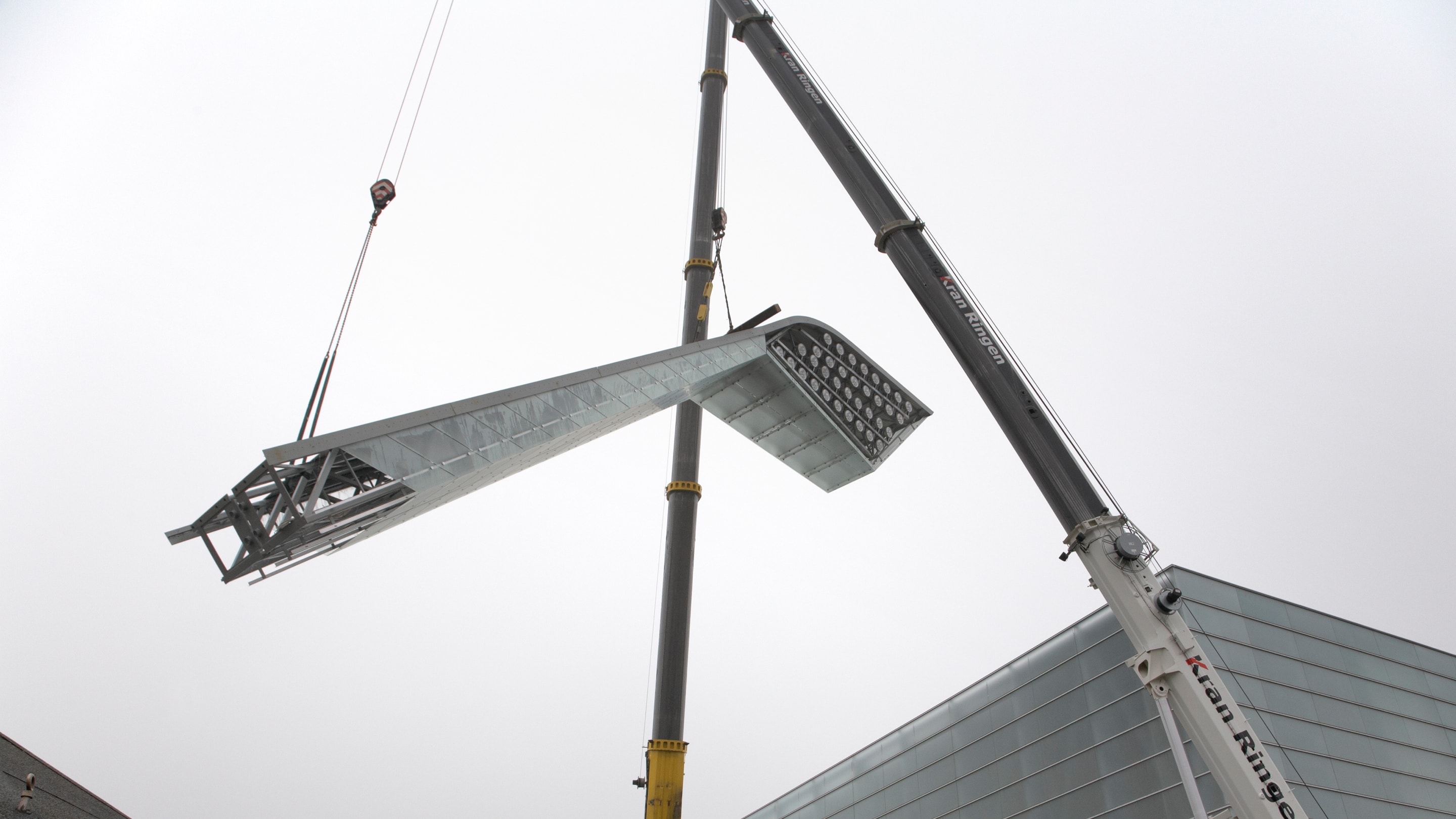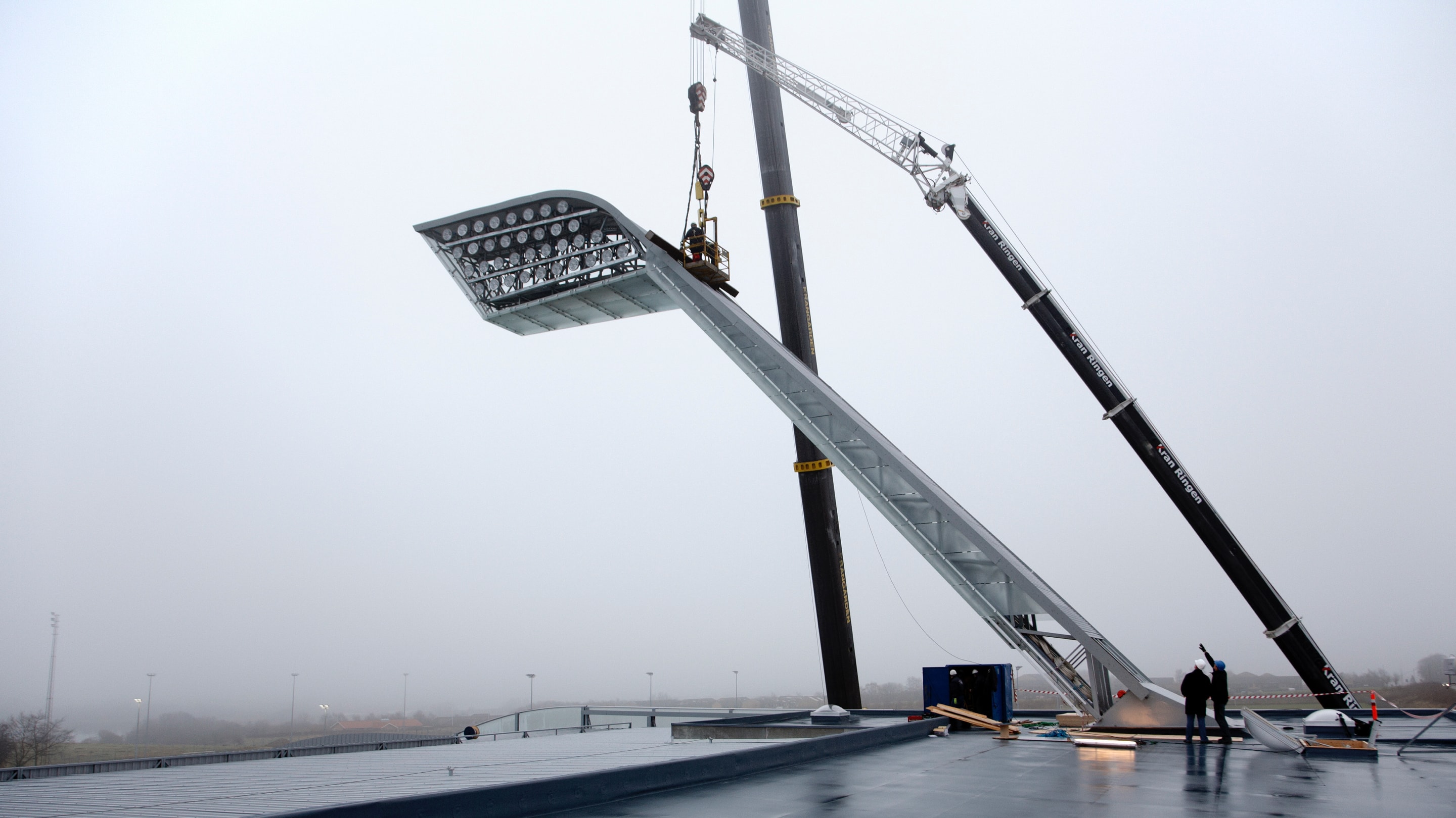 The lighting system at CASA Arena Horsens is 1,000 lux, compared to 550 lux in the previous system. Each tower weighs 25 tonnes, and a 300-tonne crane and a 450-tonne crane were required, in unison, to lift each of the four towers in place. The process required great precision, but was completed without complications.