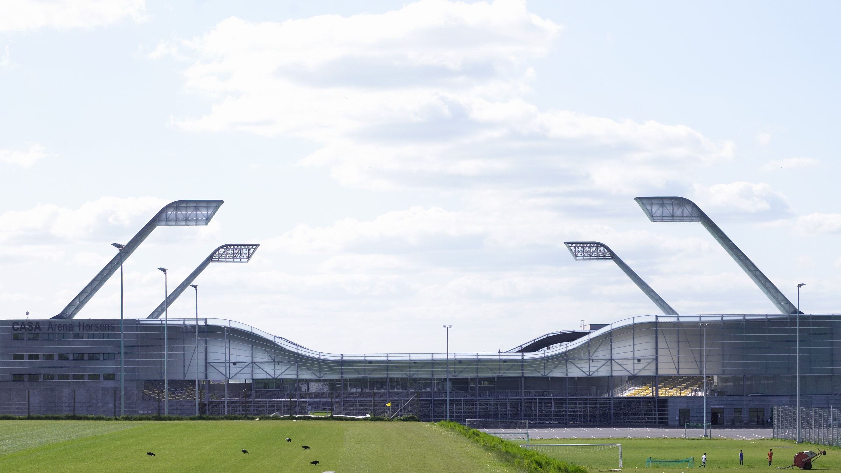 For passing motorists on the East Jutland motorway, the light towers of CASA Arena Horsens rise high above the landscape like glowing reptilian heads. The 37-metre-high towers illuminate the performances on the playing field – and building them was something of a performance in itself, with installation at a height of 16 metres.