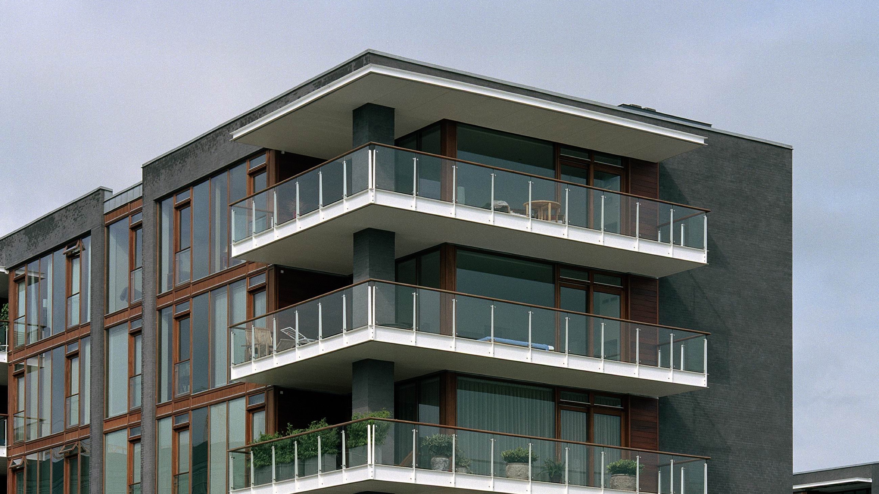 The balconies in the exclusive residential building have been designed so that the structure appears very light, and the wooden handrail almost floats above the glass panels and wedge-shaped balusters.