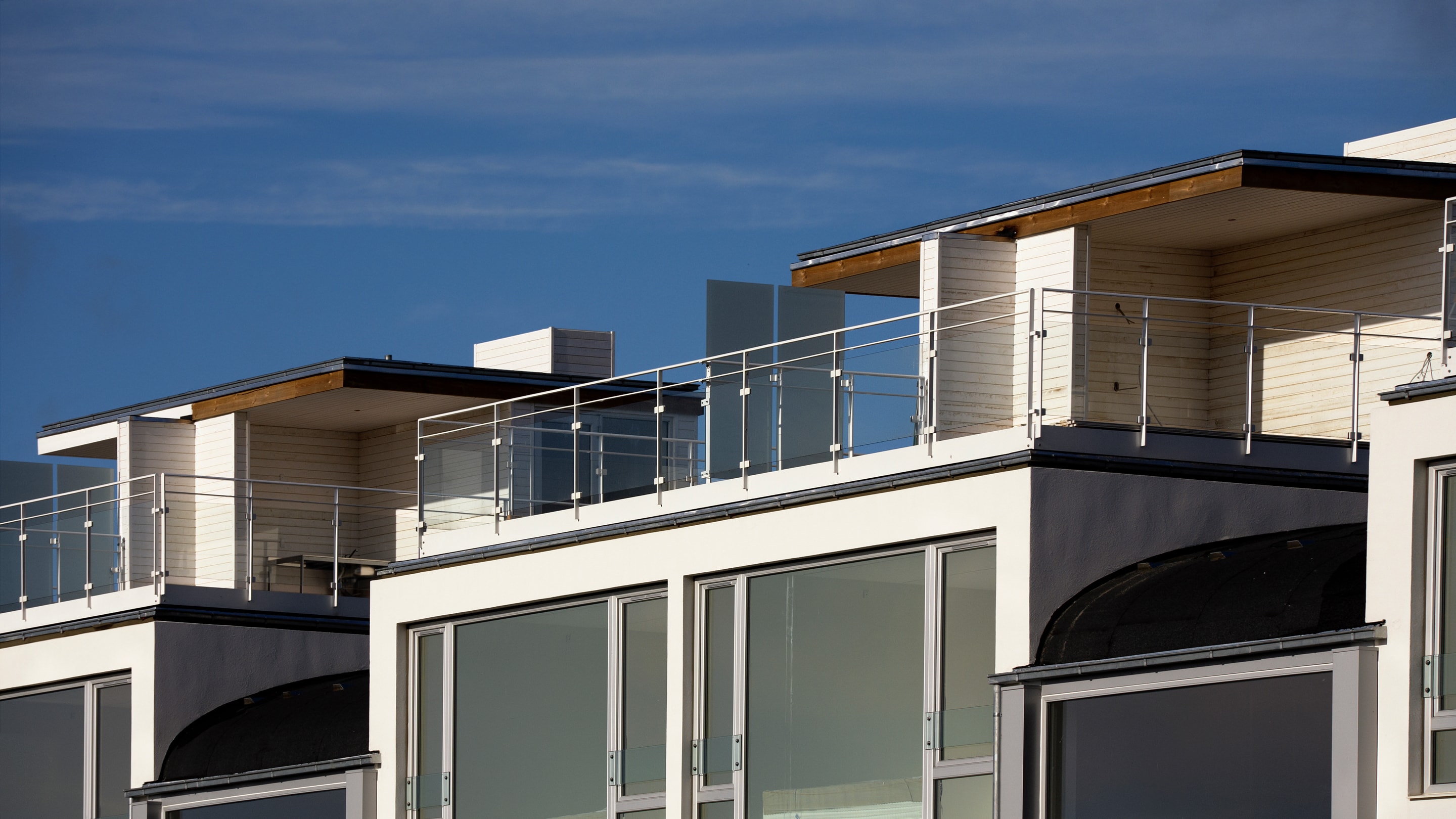 The rooftop terraces are an architectural chapter in their own right. They are designed and made with an exclusive look, that is enhanced by the white powder coating and attractive glass.