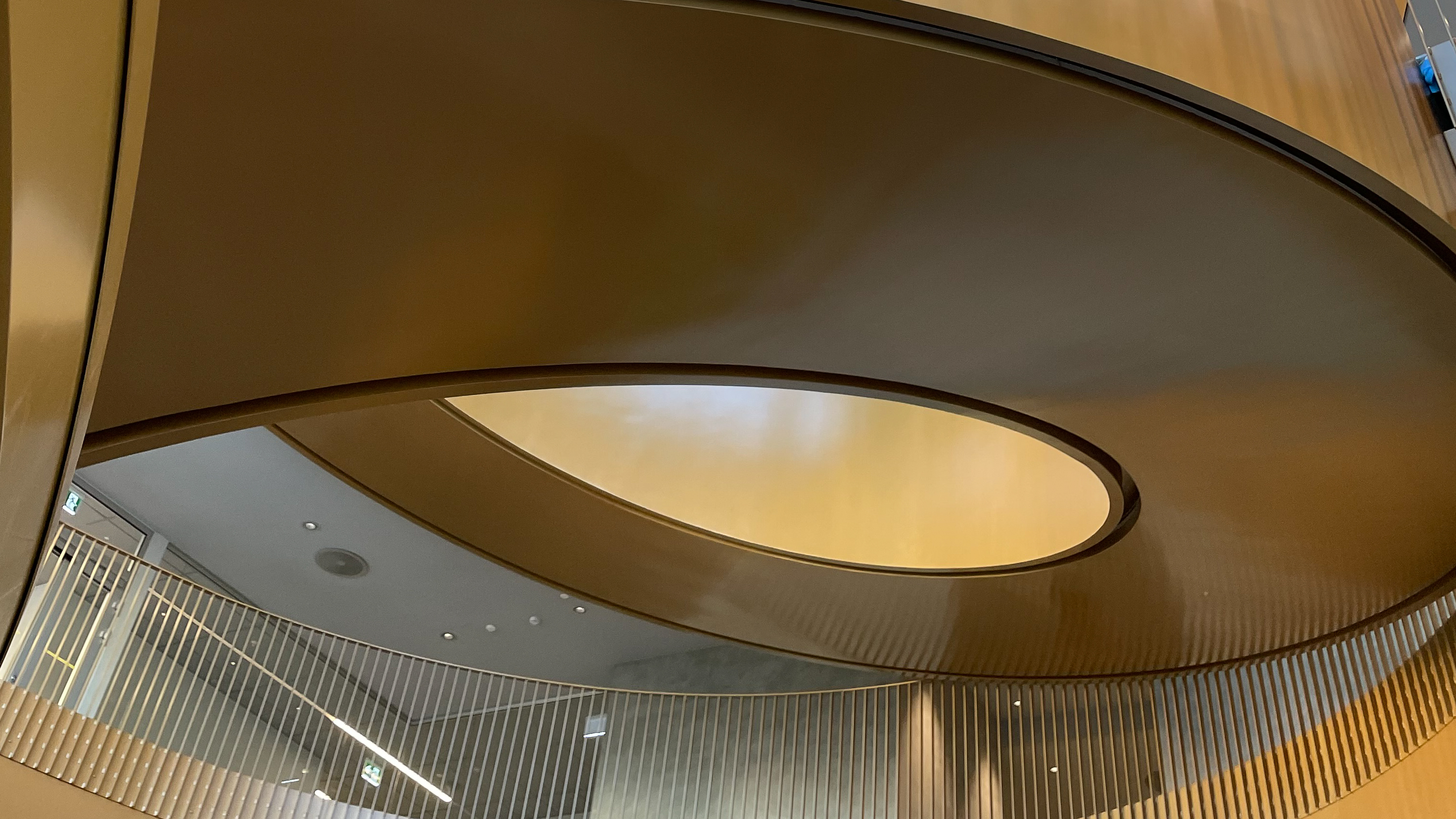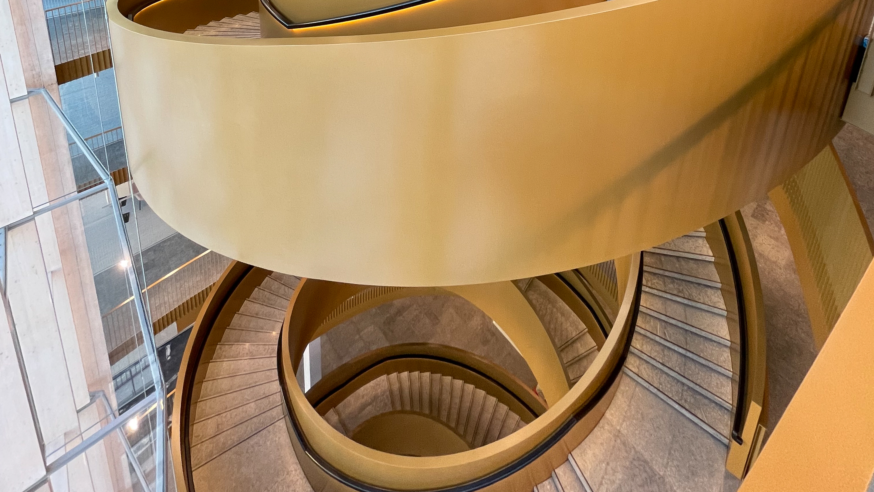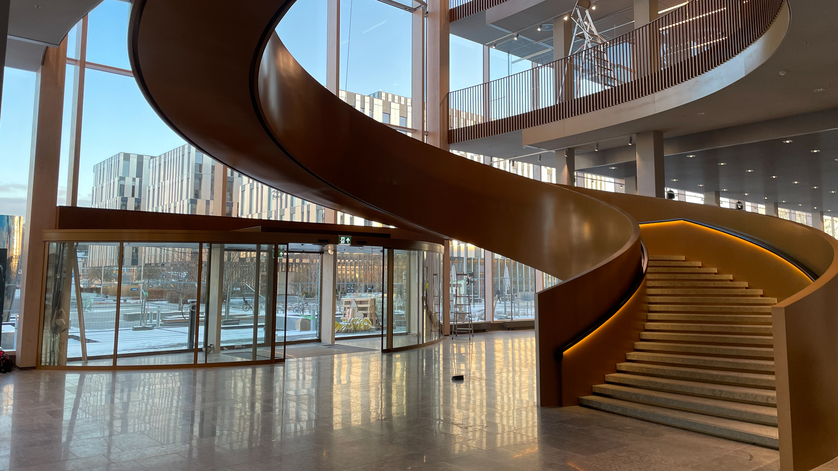 The glass facade frames the large spiral steel staircase which is the building’s hallmark. The staircase resembles a gigantic spring in the middle of the facade, and is the building’s natural hub and lifeblood. The polished golden surface catches the light and changes character depending on the weather and angle of view.