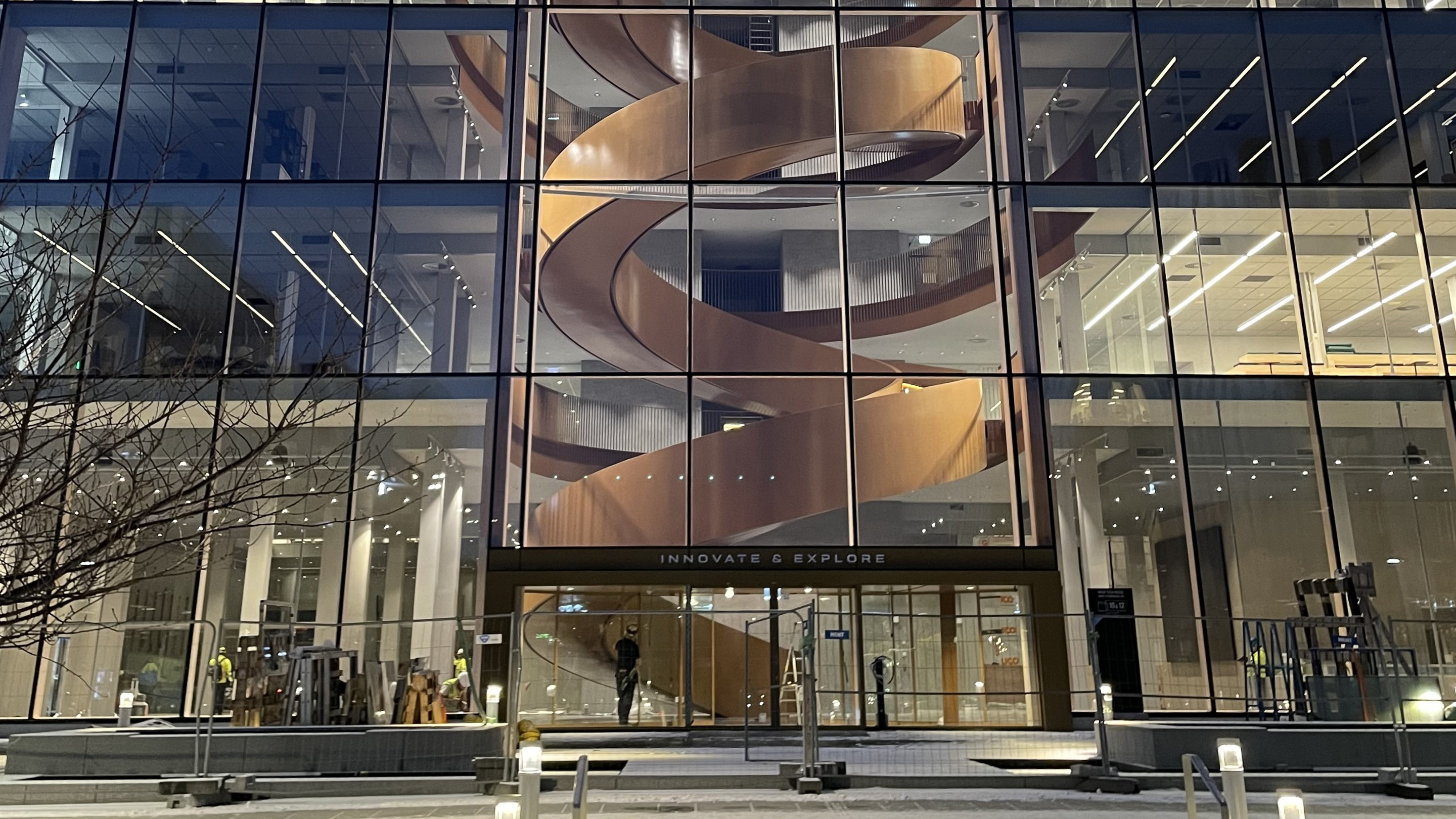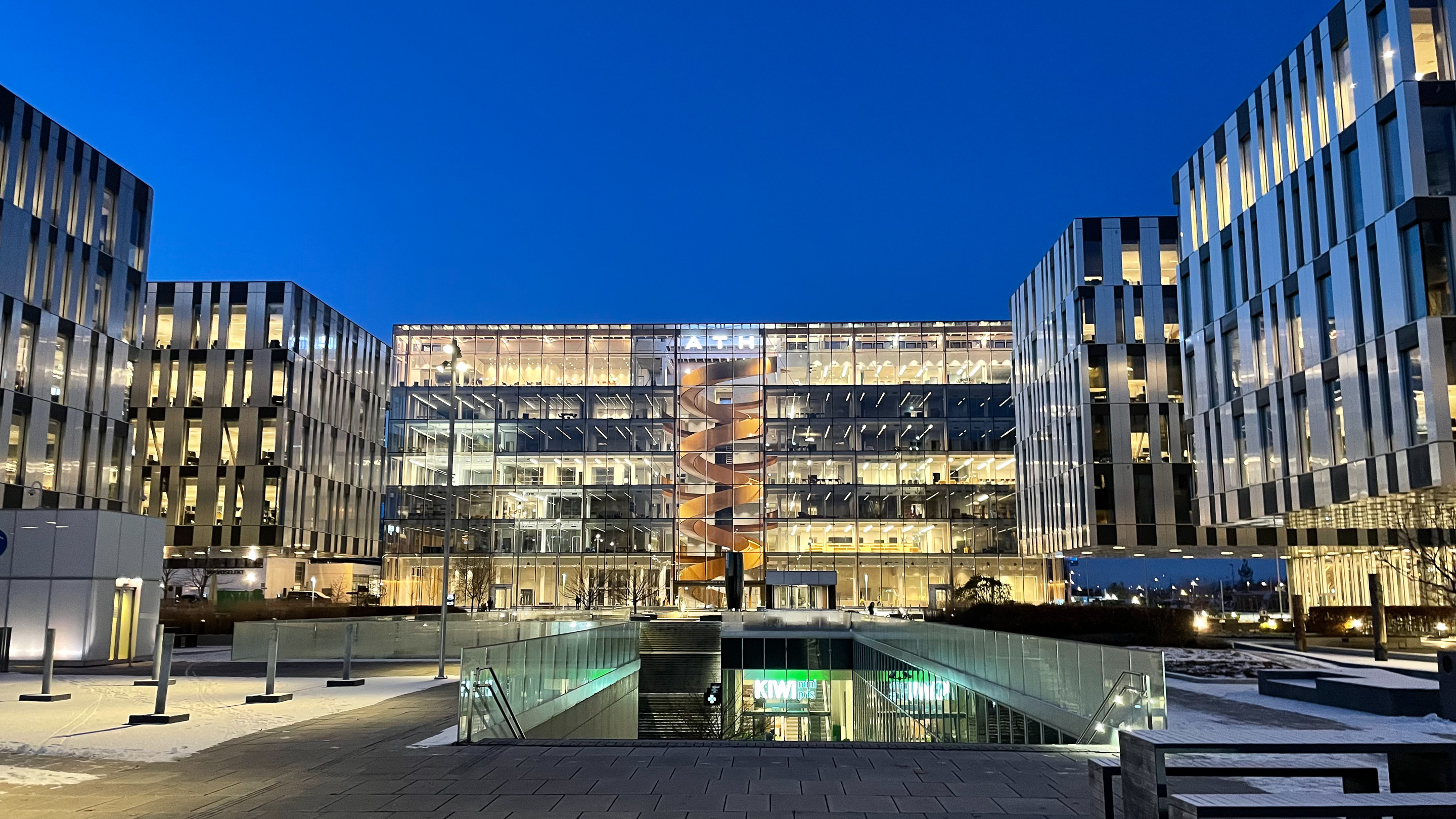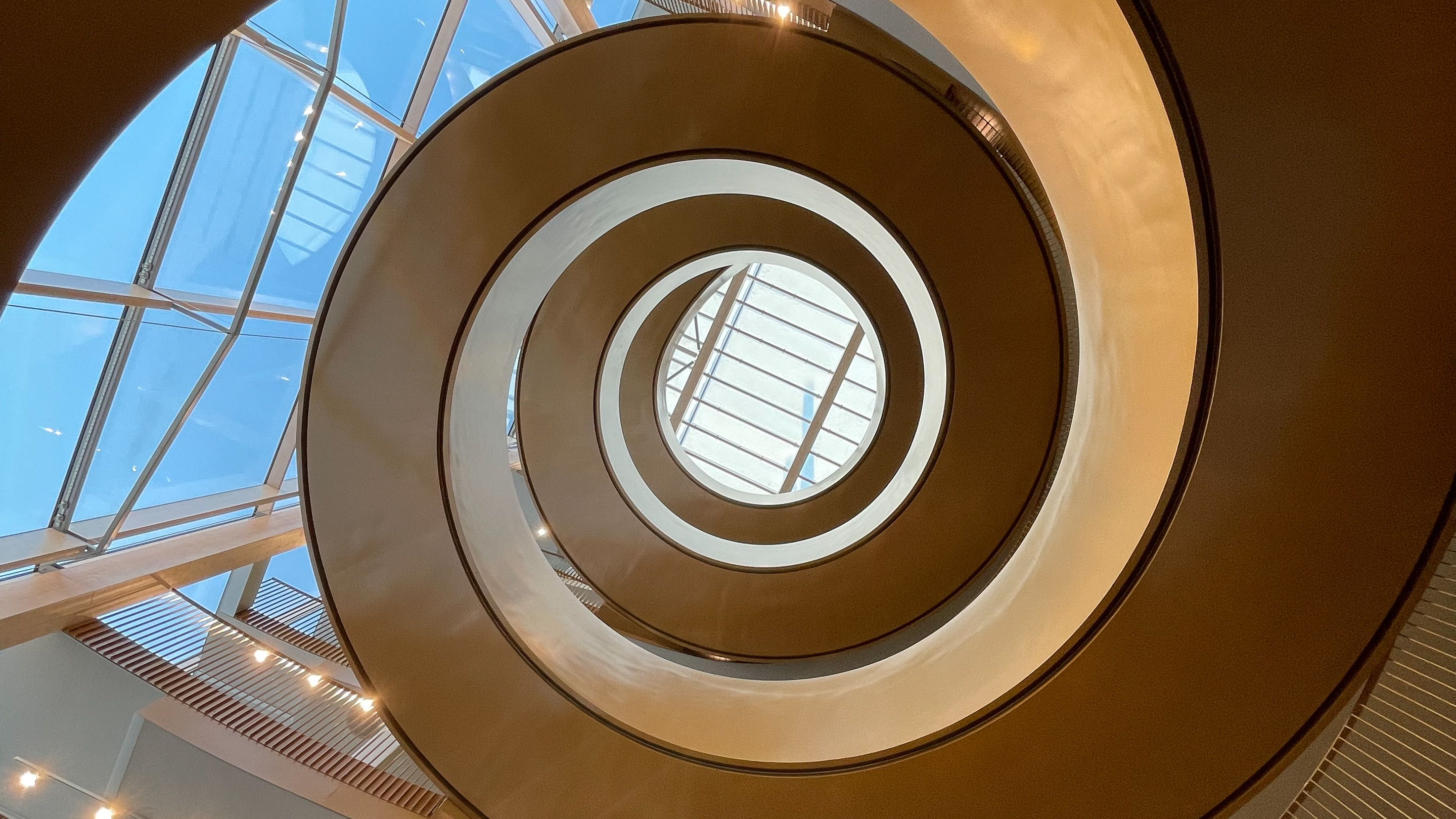 The glass facade frames the large spiral steel staircase which is the building’s hallmark. The staircase resembles a gigantic spring in the middle of the facade, and is the building’s natural hub and lifeblood. The polished golden surface catches the light and changes character depending on the weather and angle of view.